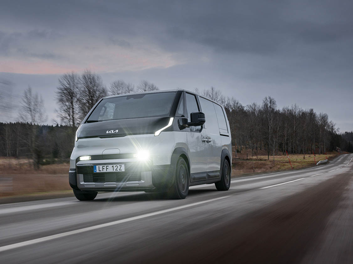 Kias första bilar i transportbilssegmentet är tre extremt kubiska versioner av PV5, en minibuss, en välbyggd distributions- och supportbil och ett chassi för specialbyggen. Det handlar om kompakta, smidiga och genomtänkta eldrivna transportfordon. Styrkan är smidigheten, sikten och lastutrymmet. Svagheten är avsaknaden av fyrhjulsdrivning och en dragvikt på endast 750 kg för skåpbilen. Minibussen får dra 1 500 kg